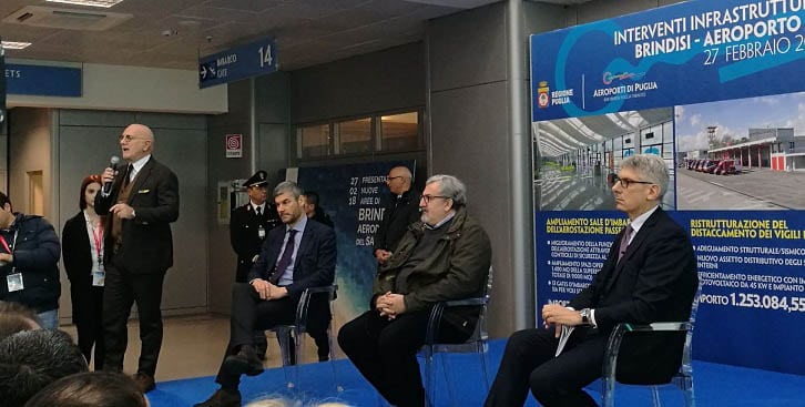 Si è tenuta questa mattina la cerimonia di presentazione delle nuove aree passeggeri dell’aerostazione e delle nuove aree operative dell’Aeroporto del Salento di Brindisi. All’evento sono intervenuti il Presidente della Regione Puglia, il Direttore Generale dell’ENAC, Alessio Quaranta, il Presidente di Aeroporti di Puglia, Tiziano Onesti, il Vice Presidente Antonio Vasile, la Consigliera di Amministrazione Beatrice Lucarella e i Rappresentanti delle Autorità Civili e Militari.