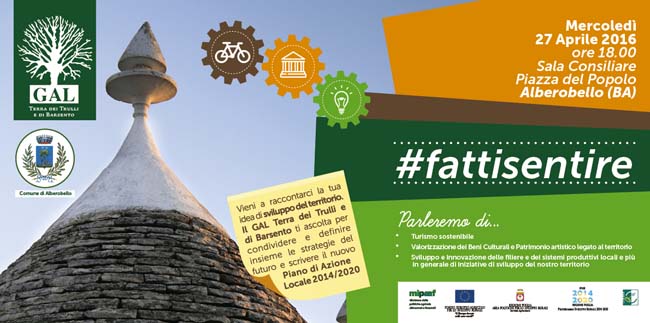 Si tratta di una serie di sette incontri già cominciati qualche settimana fa e che stanno attraversando tutti i comuni facenti parte del Gal Terra dei Trulli e Barsento. Durante l’incontro Alberobellese ci sarà un approfondimento sul tema legato alla possibilità di redigere la strategia di sviluppo del Gal Trulli e Barsento con l’approccio multi-fondo (FEASR e FEAMP) ampliando le risorse finanziarie a disposizione del territorio e diversificando le linee di intervento.
