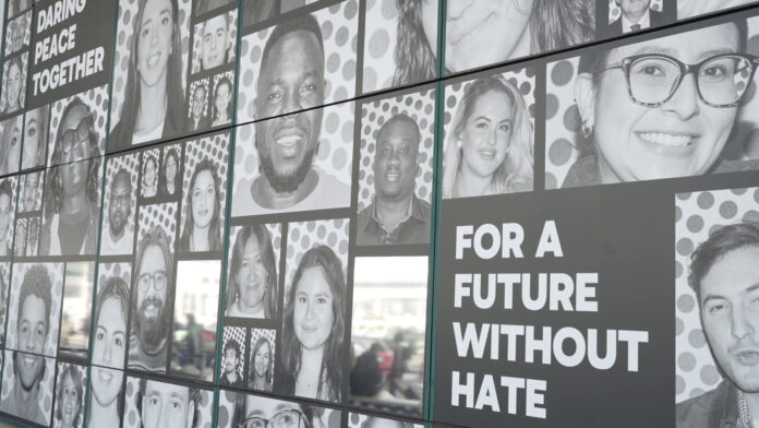 ROMA (ITALPRESS) – Un grande messaggio di pace accoglierà da oggi i passeggeri in partenza dall’Aeroporto di Roma Fiumicino. Su una vetrata di oltre 100 metri quadri all’ingresso del terminal 1, è stata inaugurata l’opera collettiva “Daring peace together, for a future without hate”, un’iniziativa di Unhate Foundation, realtà del Terzo Settore ideata da Alessandro Benetton, insieme ad Aeroporti di Roma, Comunità di Sant’Egidio e a Studio Kene. Gli scatti sono stati realizzati dai giovani di Studio Kene – il laboratorio permanente di fotografia per ragazzi creato da Mohamed Keita – in occasione dell’Incontro Internazionale per la Pace organizzato dalla Comunità di Sant’Egidio lo scorso ottobre a Roma. Le immagini, potenti e dirette, ritraggono 108 persone che hanno deciso di “metterci la faccia” per “Osare la Pace, Insieme”.