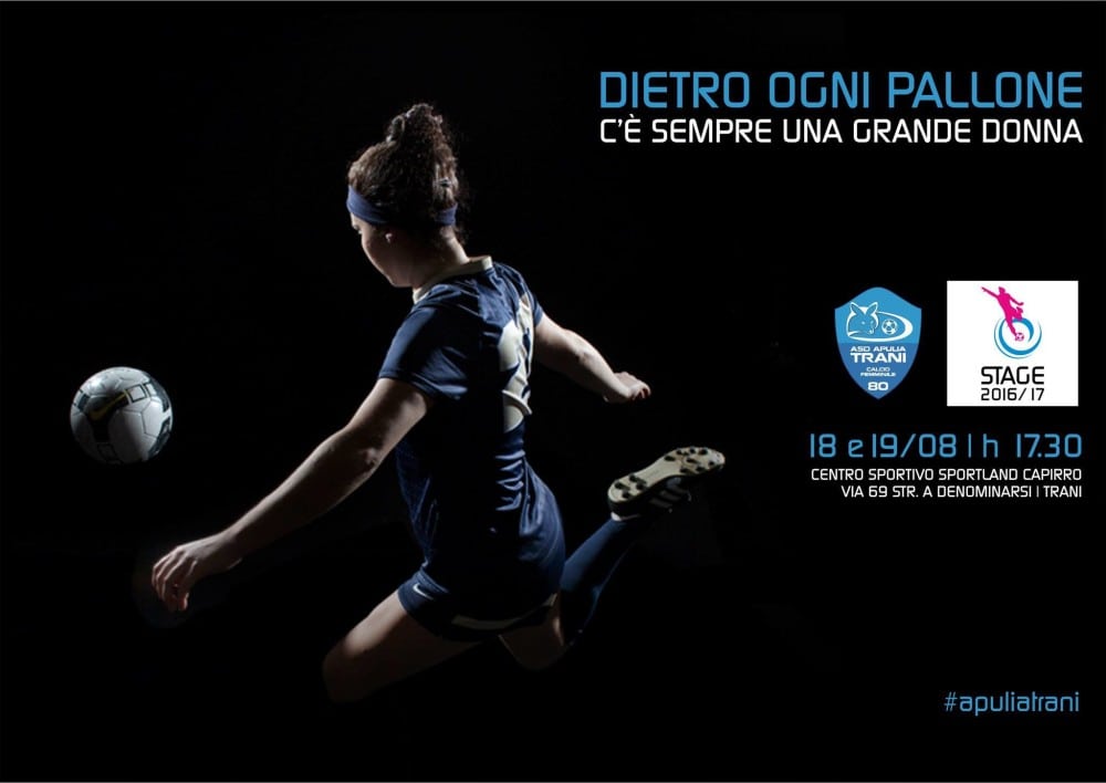 Giovedì 18 e venerdì 19 agosto a partire dalle 17.30 l’Apulia Trani organizza presso il centro Sportland Capirro a Trani uno stage per ragazze che vogliano avvicinarsi al mondo del calcio femminile.