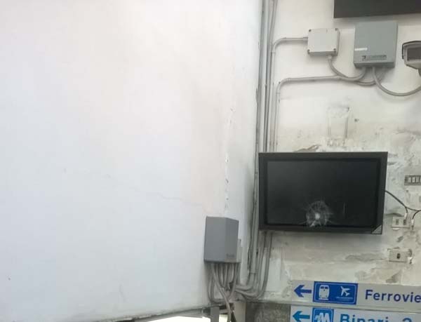 Dei vandali ignoti hanno imbrattato le pareti, spaccato il monitor e il bordo superiore del corridoio. Sul pavimento ci sono cocci di bottiglia e calcinacci. Probabilmente le telecamere non erano in funzione per i lavori in corso e molti monitor e tabelloni sono spenti.