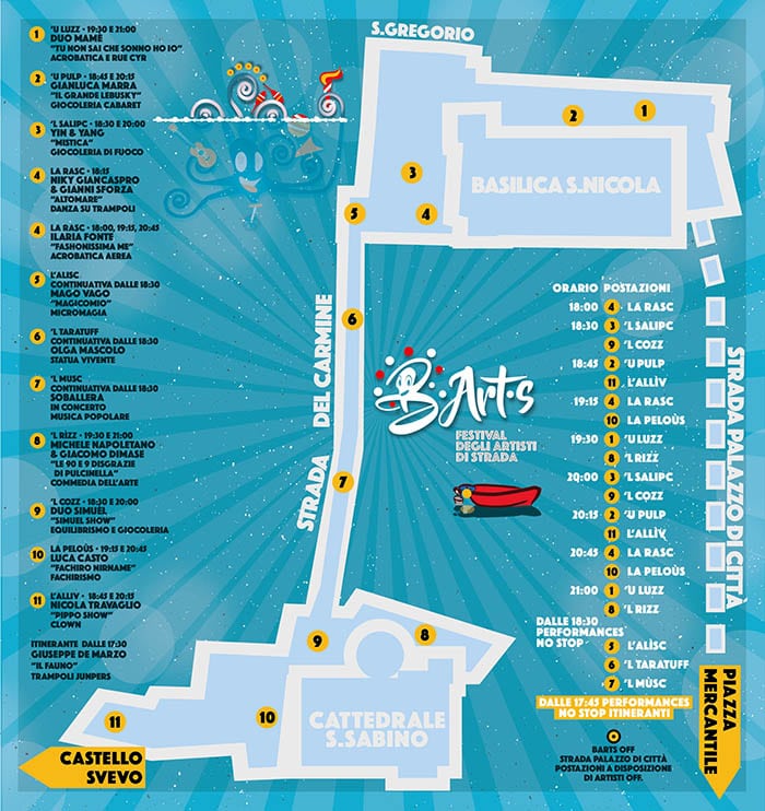 quindi gli artisti. Il percorso si snoderà tra la Basilica di San Nicola e la Cattedrale. Alle postazioni fisse di aggiungeranno gli artisti off che in questi giorni stanno chiedendo spazi per presentare le proprie produzioni e che, d’accordo con gli organizzatori, si esibiranno in strada Palazzo di Città.