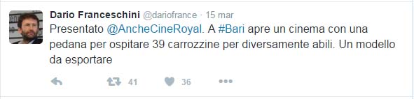 “Presentato @AncheCineRoyal. A #Bari apre un cinema con una pedana per ospitare 39 carrozzine per diversamente abili. Un modello da esportare”.