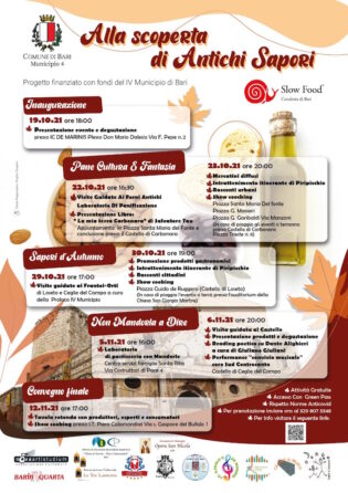 La manifestazione, sostenuta dal Municipio IV e curata da Slow Food – Condotta di Bari, nasce per promuovere i prodotti tipici dei quartieri che compongono il territorio municipale e tracciarne l’antica storia e le tradizioni attraverso visite guidate, degustazioni e laboratori culinari.