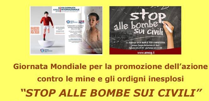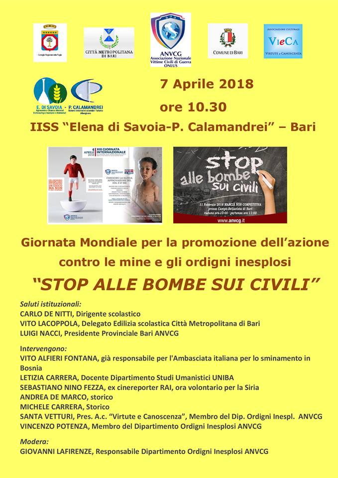 Sabato 7 aprile nell’Aula Magna dell’IISS “Elena di Savoia” a Bari sarà celebrata la Giornata mondiale per l’azione contro le mine e gli ordigni inesplosi, proclamata dall’ONU, che ricorre ogni anno il 4 aprile dal 2005. All’evento, organizzato dall’Associazione Nazionale Vittime Civili di Guerra con il Patrocinio della Città Metropolitana di Bari e del Comune di Bari, interverranno Vito Alfieri Fontana, già responsabile per l’Ambasciata Italiana dello sminamento in Bosnia, Sebastiano Nino Fezza, ex cinereporter Rai nei teatri di guerra, gli storici Michele Carrera e Andrea Di Marco, Letizia Carrera, docente del Dipartimento Studi Umanistici dell’Università di Bari, Santa Vetturi, Presidente dell’associazione Virtute e Canoscenza, Enzo Potenza, del Dipartimento Ordigni Bellici Inesplosi. Modera Giovanni Lafirenze, responsabile del Dipartimento Ordigni bellici Inesplosi.