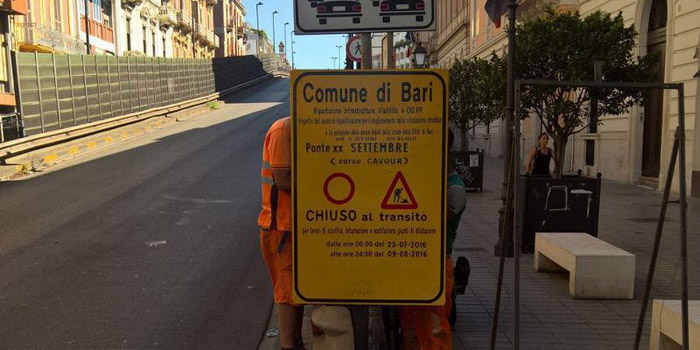 Da domani mattina, lunedì 25 luglio, e per circa quindici giorni sono previsti disagi gli automobilisti del centro di Bari. Partiranno, infatti, dei lavori di manutenzione al ponte XX settembre, che collega corso Cavour a viale Unità d’Italia. In particolare l’intervento riguarderà il ripristino dei giunti esistenti, le cui cattive condizioni determinano forte inquinamento acustico e ammaloramento del piano stradale.