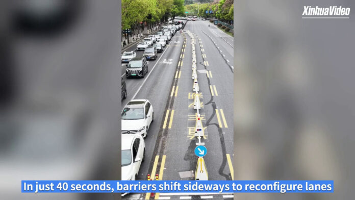 Per far defluire il traffico più agevolmente, soprattutto nelle ore di punta e nelle aree vicino alle scuole, nella città cinese di Hangzhou sono state introdotte corsie spartitraffico robotizzate. Un sistema intelligente per gestire la congestione della circolazione, capace di riconfigurare le corsie – quando necessario – in soli a 40 secondi. (XINHUA/ITALPRESS)