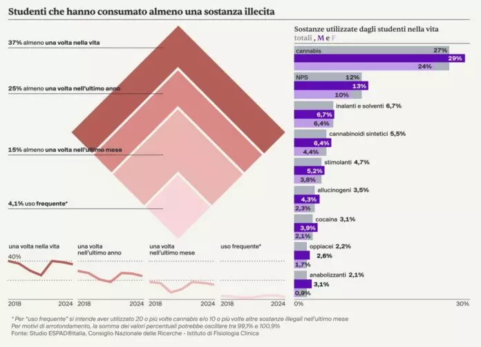 Nel 2024, il consumo di sostanze tra gli studenti è diminuito rispetto all’anno precedente. Dal 2023 al 2024, il consumo di cannabinoidi è passato dal 22% al 21%, le NPS dal 6,4% al 5,8%, i cannabinoidi sintetici dal 4,6% al 3,5%, gli stimolanti dal 2,9% al 2,4%, la cocaina dal 2,2% all’1,8%, gli allucinogeni dal 2,0% all’1,2%. Solo gli oppiacei restano stabili all’1,2%. Questi dati indicano una diminuzione del consumo di sostanze più pericolose e complesse, a fronte di un uso ancora significativo della cannabis, che rimane la droga più diffusa tra i giovani.