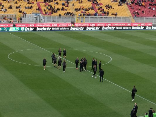 L’arrivo dei giallorossi sul terreno di gioco davanti già a un nutrito pubblico che si scioglie in un applauso d’incoraggiamento porta con sé un po’ di quell’ansia ore match che ha contrassegnato questi giorni difficili dopo la mancata promozione direttamente a Vicenza.
