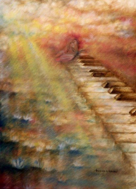 “Sconfini oltre i confini della creatività moderna” si è rivelato un incontro per approfondire i temi dell’arte attuale, un dialogo tra artisti. La pittrice nell’opera ha rappresentato un desiderio che si esprime nella poesia cromatica del volo di una farfalla che si posa delicatamente su un tasto del pianoforte che collega cielo e terra sconfinando oltre l’immaginazione.