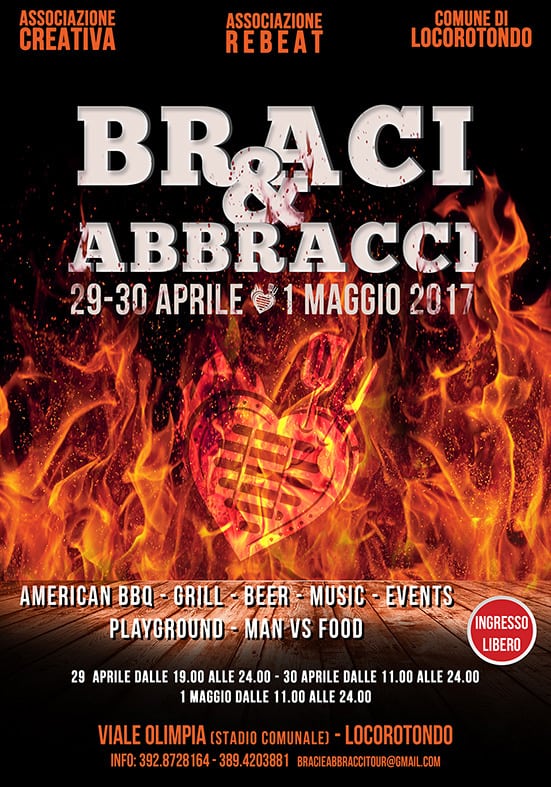 Braci, musica e divertimento. E’ l’idea vincente lanciata dalle associazioni “Creativa” e “Rebeat” di Martina Franca, che hanno organizzato, nel cuore della valle d’Itria, un ponte del primo maggio davvero imperdibile. “Braci e abbracci”, questo il titolo dell’evento che si svolgerà il 29 aprile (dalle 19 alle 24), il 30 e il primo maggio (orario continuato dalle 11 alle 24) a Locorotondo, in viale Olimpia (ingresso libero), dove l’eccellenza del fornello pugliese “sposerà” la tecnica del barbecue americano.