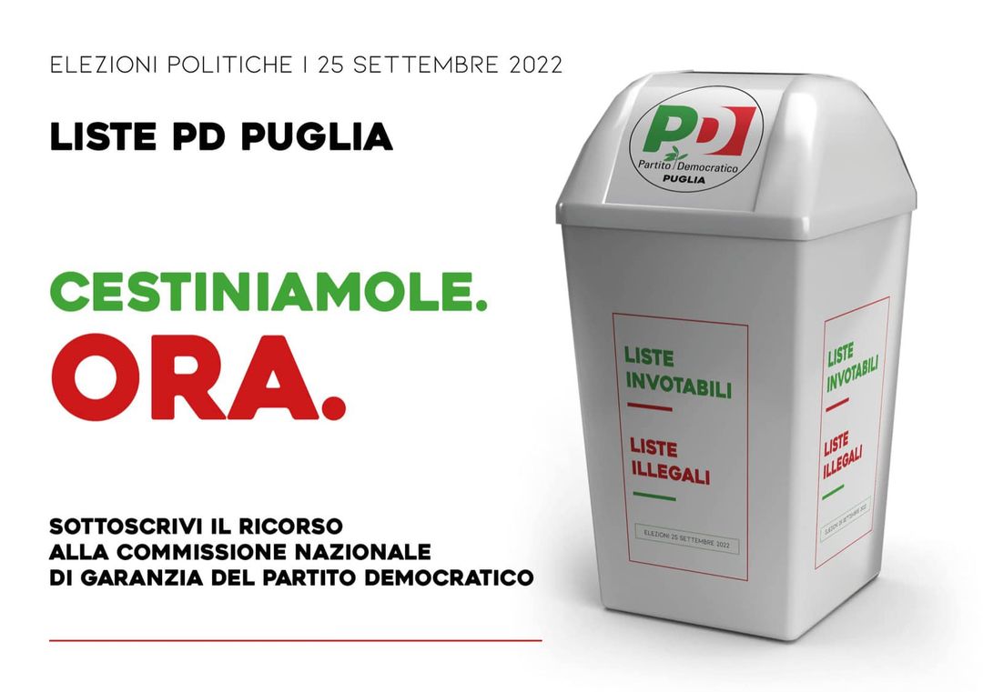 “In qualità di iscritto/elettore/aspirante elettore del PD, sottoscrivo il ricorso presentato il 18.8.2022 da Fabiano Amati e Ruggiero Mennea”.