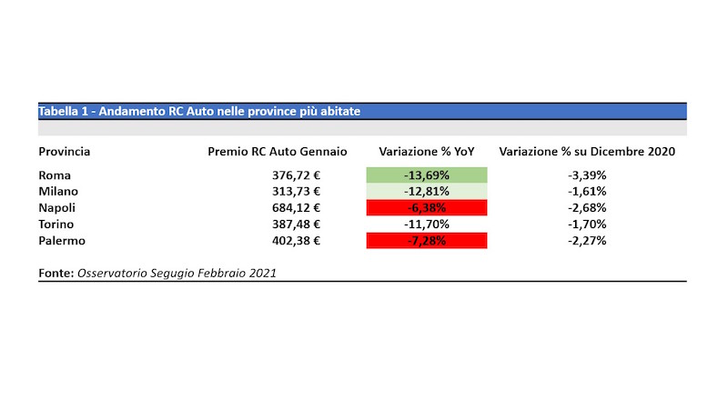Analizzando l’andamento dei prezzi nelle province più popolose (Tabella 1), spiccano Roma e Milano con una riduzione dei prezzi anno su anno sopra la media nazionale, mentre Napoli e Palermo, caratterizzate da un premio medio più alto, registrano un calo annuale a singola cifra.