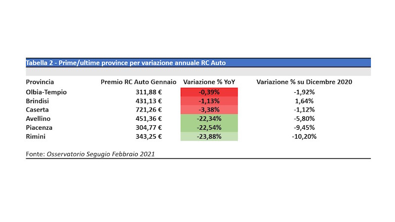 Rimini, Piacenza e Avellino, come riportato nella Tabella 2, sono le province in cui si è registrata la riduzione annuale maggiore, superiore al 22%, mentre Olbia-Tempio, Brindisi e Caserta quelle in cui i prezzi sono rimasti più stabili.