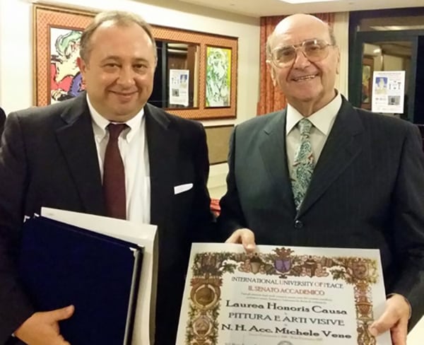 Laurea honoris causa per l’artista sanseverese Michele Vene. Il prestigioso riconoscimento è stato conferito dall’International University of Peace, che ogni anno premia le personalità che meglio si sono distinte nei diversi campi del sapere. Alla cerimonia di consegna della laurea honoris causa ha partecipato in rappresentanza del Comune di San Severo, il Vice Sindaco Francesco Sderlenga.