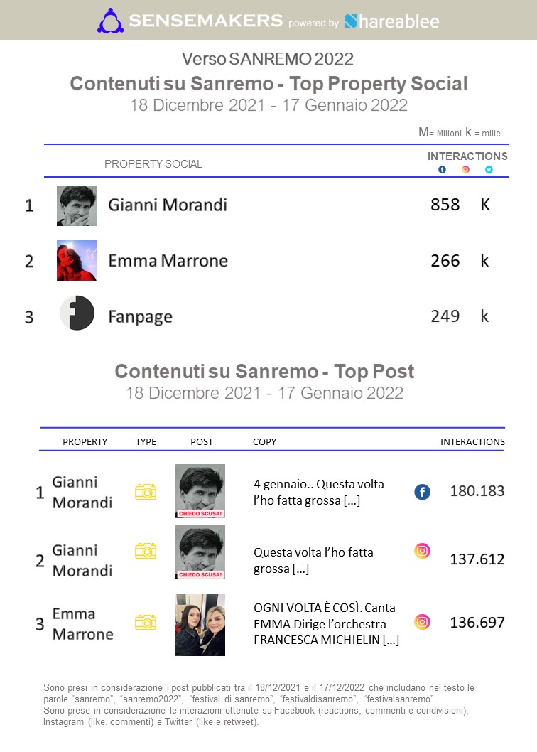 L’altro indizio arriva dall’analisi condotta da Sensemakers sui dati Shareablee relativi alle interazioni ottenute sui social dalle pagine pubbliche che abbiano parlato di Sanremo nell’ultimo mese (periodo 18 dicembre 2021 – 17 gennaio 2022).