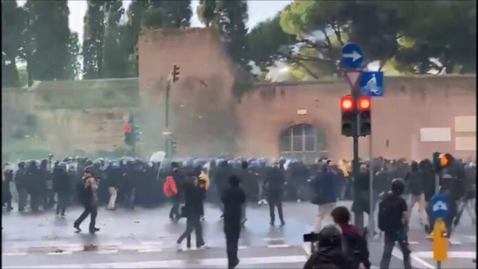 ROMA (ITALPRESS) – Guerriglia urbana in piazzale Ostiense alla manifestazione non autorizzata pro Palestina. Dopo oltre tre ore di calma totale, alcuni manifestanti incappucciati si sono avvicinati alle forze dell’ordine che ne avevano impedito il corteo per tutto il pomeriggio, ne è nata una colluttazione che ha portato al lancio di sassi e bottiglie, fumogeni e petardi. La polizia ha risposto immediatamente, poi ha disperso la folla con gli idranti. Molti manifestanti protestano contro la decisione di attaccare le forze dell’ordine, il corteo infatti era stato ufficialmente sciolto pochi minuti prima dagli stessi organizzatori.