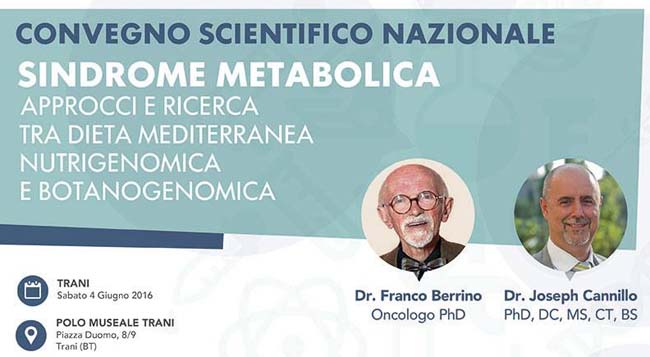 Berrino e Cannillo, nel corso delle due sessioni del convegno dal titolo eloquente “Sindrome Metabolica. Approcci e ricerca tra Dieta Mediterranea, Nutrigenomica e Botanogenomica”, come anticipato, illustreranno attraverso riferimenti specifici ai due approcci, i benefici della Dieta Mediterranea come possibile “strumento” per ridurre le probabilità di contrarre i gravi disturbi e le patologie riconducibili alla sindrome.