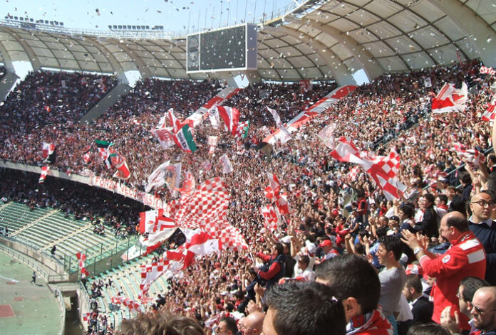 1′ Partiti. Bari in completa tenuta rossa che attacca da sinistra verso destra rispetto alle panchine.