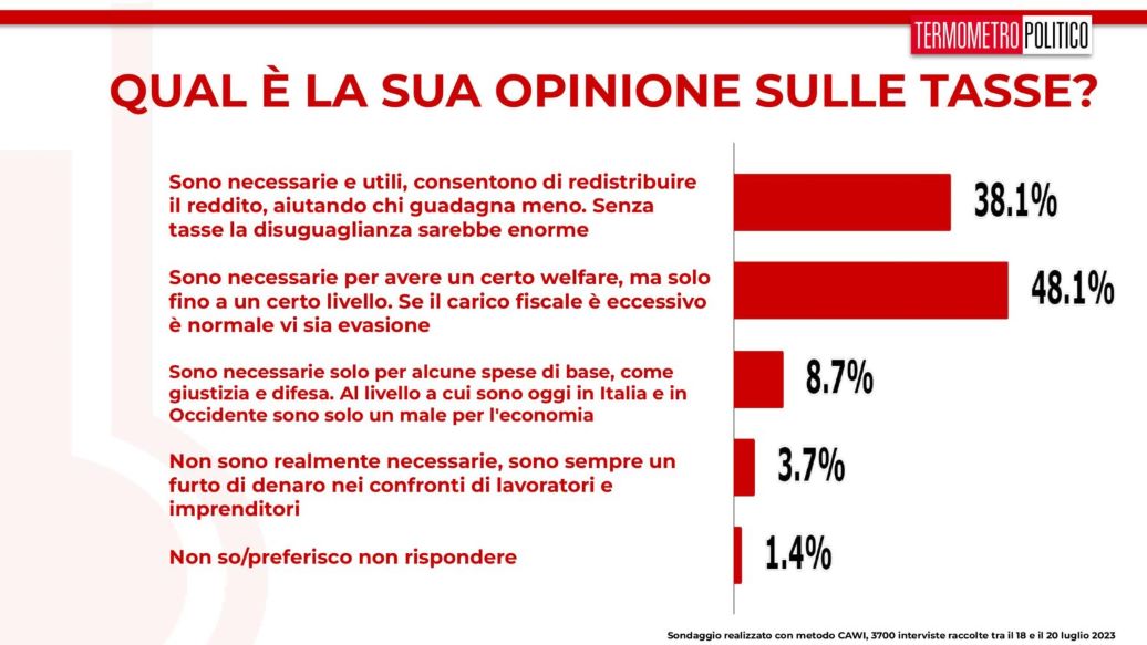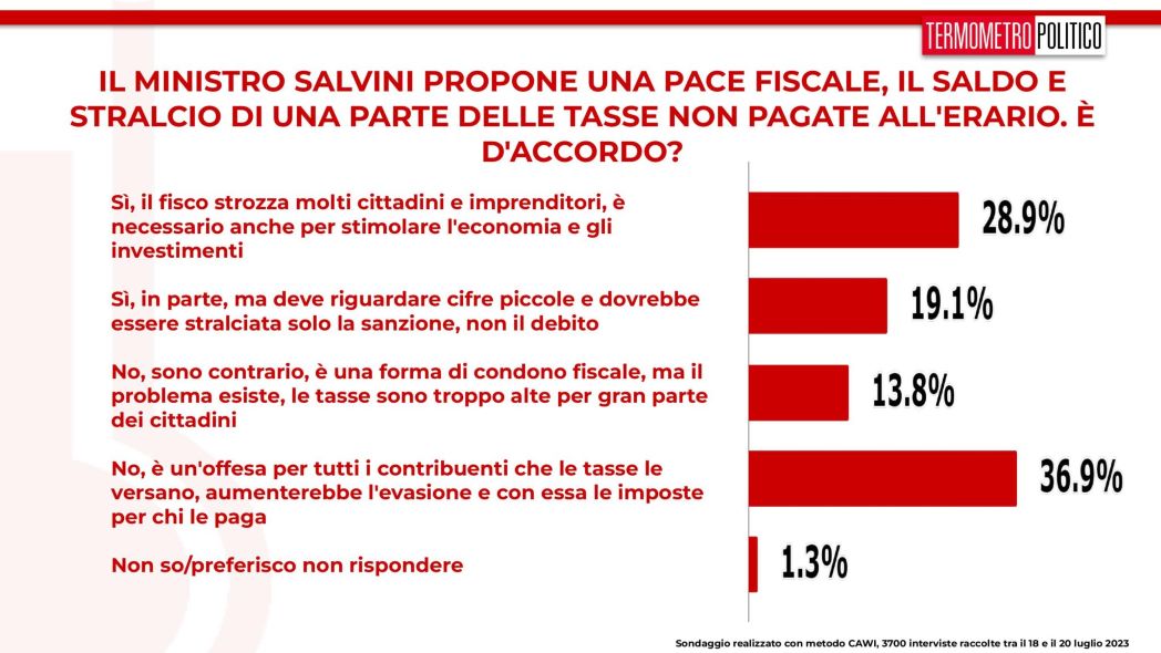 La maggioranza degli italiani sembra non gradire la pace fiscale proposta dal ministro Matteo Salvini. Secondo i dati raccolti dal sondaggio settimanale realizzato da Termometro Politico tra il 18 e il 20 luglio 2023 il 36,9% la boccia per due motivi: sarebbe un’offesa per tutti i contribuenti che le tasse le versano e farebbe aumentare l’evasione e con essa le imposte per chi le paga. Un ulteriore 13,8%, seppur consapevole del problema legato alle tasse troppo alte, la respinge perché ritiene la pace fiscale una forma di condono fiscale. Il 19,1% è, invece, d’accordo a patto che riguardi cifre piccole con lo stralcio della sola sanzione. Il 28,9% la ritiene necessaria anche per stimolare l’economia e gli investimenti.