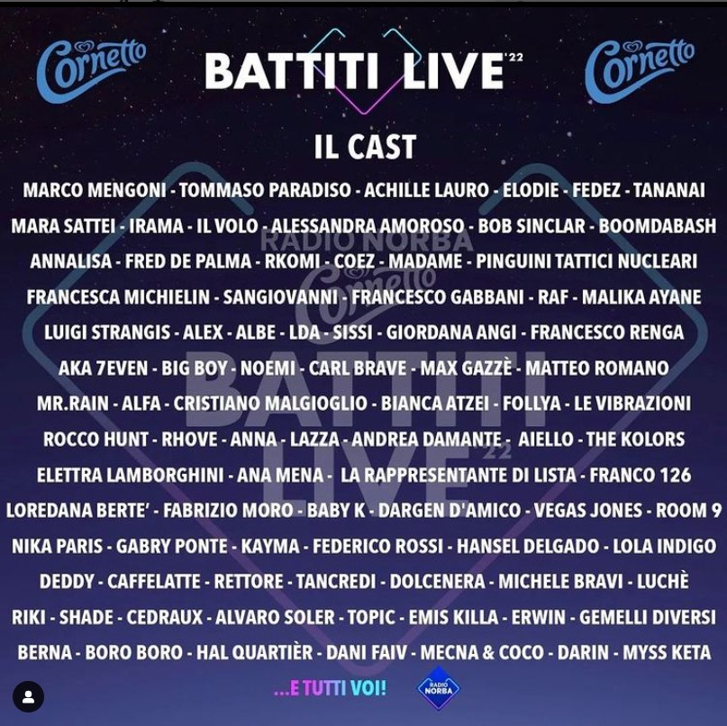 Saranno 80 gli artisti che produrranno 200 performance. Ecco alcuni dei cantanti che compongono il cast: Marco Mengoni, Tommaso Paradiso, Achille Lauro, Elodie, Fedez, Irama, Il Volo, Alessandra Amoroso, Bob Sinclar, Boomdabash, Annalisa, Francesco Gabbani, Madame, Francesco Renga, Noemi. E poi gli inossidabili Cristiano Malgioglio, Rettore, Dolcenera, Gemelli Diversi, Raf, Malika Ayane, Max Gazzè, Fabrizio Moro, Le Vibrazioni. E anche alcuni fra i più amati dai giovanissimi: Rkomi, Coez, Pinguini Tattici Nucleari, Tananai, Luigi Strangis, Sangiovanni, Aka 7even, Baby K, Ana Mena, Carl Brave, Dargen D’Amico, Rappresentante di Lista, Gabry Ponte, Alvaro Soler, Matteo Romano, The Kolors, Emis Kylla, Shade, Michele Bravi. Le cinque serate saranno trasmesse in tv anche da Italia 1.