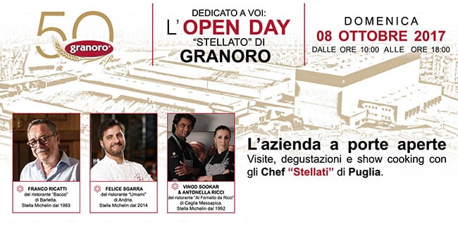 Per Granoro, che nel 2017 celebra i suoi 50 anni di attività, tornare ad aprire le proprie porte al pubblico e ai tanti consumatori che ogni giorno apprezzano la qualità dei suoi prodotti, è sempre un grande motivo di orgoglio: per questo mostrare i luoghi in cui ogni giorno una vera e propria famiglia allargata si impegna con amore e passione per portare sulle tavole di 180 paesi nel Mondo il “Made in Puglia” tornerà a essere un momento di condivisione con chi ogni giorno apprezza il brand Granoro.