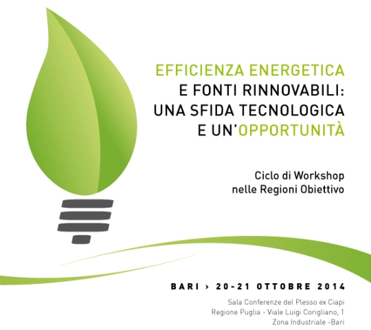 Il Ministero dell’Ambiente, nell’ambito del programma POI – Programma Operativo Interregionale – Energia 2007-2013, ha organizzato un ciclo di workshop tematici suddivisi in due appuntamenti, nelle Regioni Obiettivo Convergenza. A Bari, i due incontri dal titolo “Efficienza energetica e fonti rinnovabili: una sfida tecnologica e un’opportunità”, sono previsti per il 20 e 21 ottobre, presso la Sala Conferenze del Plesso ex Ciapi – Regione Puglia in viale Luigi Corigliano, nella Zona Industriale di Bari.